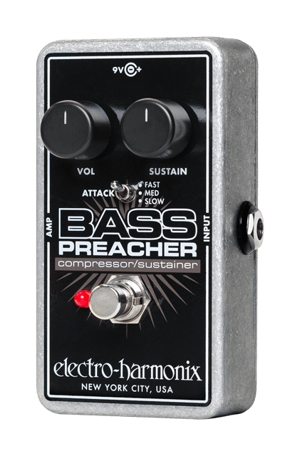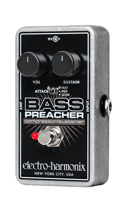 Electro Harmonix - Bass Preacher - Kompressor / Sustainer - Designet af bassister til bassister. Med 3 indstillingsmuligheder for kompressor (Attack: Fast, Mid, Slow) og mulighed for justering af sustain og volume. God til soul og funky stuff.
