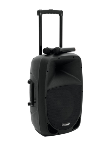OMNITRONIC MES-12BT2 Wireless PA System - Super Trolley med masser af muligheder. Kommer med en 12" bas og kan klare 4-5 timer på batteri, rumklangseffekt til mikrofoner, 5 bånds EQ, 2 x master output (mono), terminaler til 12V batteri (f.eks. biler eller camping) og selvfølgelig bluetooth. Inkl. 2 mikrofoner. Max power: 90W (45W RMS). SUPER DUPER til parker, gågader og andre offentlige steder, hvor der skal festes!!!