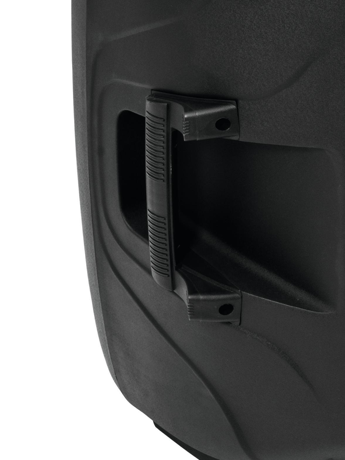 - Light-weight black plastic enclosure with metal grille, monitor shape and carrying handles
