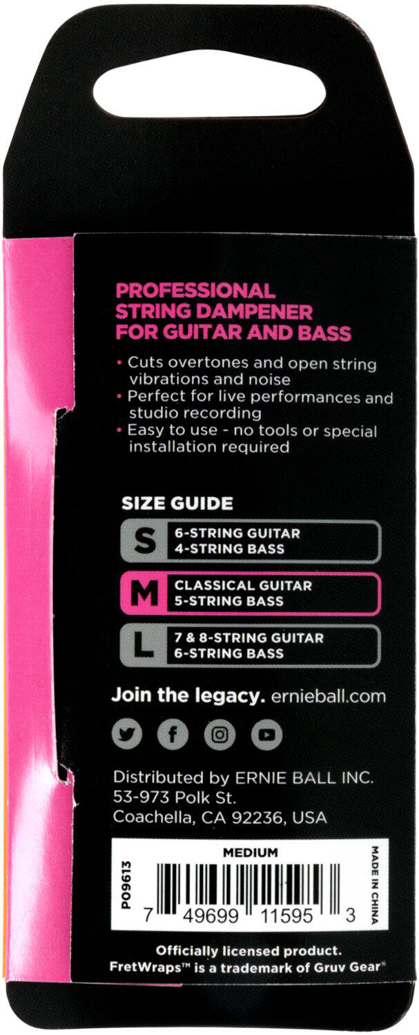 Ernie Ball FretWrap fra Gruv Gear er en professionel strengdæmper/muting-tilbehør, som ethvert studie-, sessions- og tapende aficionado burde have! Skub på FretWrap for effektivt at skære overtoner og sympatisk resonans under indspilning, live-optræden, tohånds-tapping eller enhver kreativ situation, hvor du har brug for den ekstra dæmpende hånd til renere optagelser uden uønsket strengstøj eller ringen. Den justerbare rem giver dig mulighed for at finjustere trykket og dæmpningen af strengene. Du kan hurtigt skubbe dæmperen hen over hovedet på guitaren, når den ikke er i brug. Ingen speciel guitarmodifikation, installation eller værktøj krævet - men alligevel forbløffende effektiv! Medium - Passer til 5-strengede basser og 6-strengede klassiske guitarer.