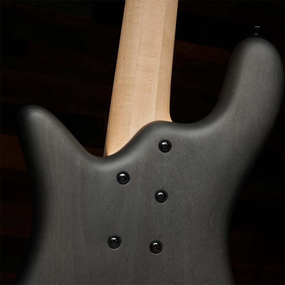 Basens krop er bygget af europæisk elletræ, toppet med nordamerikansk flammet ahorn, hvilket giver både varme og definition i tonen. Den 3-delte boltede hals af ahorn sammen med et palisandergribebræt skaber en solid, responsiv og komfortabel spiloplevelse.