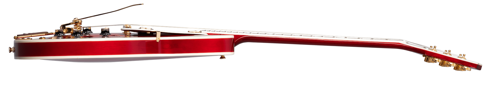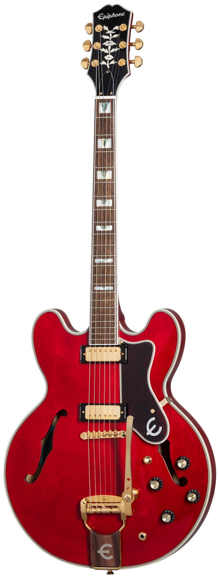 Introduktion af den begrænsede udgave af Epiphone 150th Anniversary Sheraton. Dette elegante instrument blev skabt til fejring af Epiphones 150-års jubilæum. Den har en semi-hul krop lavet af lagdelt ahorn med en ahorn centerblok for feedback modstand. Den 22-båndede mahognihals i ét stykke har et indbundet indisk laurbær gribebræt med blokperlemor og abalone indlæg. Det indbundne hovedstykke har et historisk Epiphone-logo og livets træ i perlemor på forsiden og et guld Epiphone 150-års jubilæumslogo på bagsiden. Epiphone 150th Anniversary Sheraton kommer med førsteklasses elektronik, inklusive fremstillede i USA Gibson Mini Humbucker™ pickupper tilsluttet CTS® potentiometre, Orange Drop® kondensatorer og en Switchcraft® tre-vejs pickup vælgerkontakt og 1/4" udgang jack. Den blanke Cherry-finish komplimenteres af guldhardware, herunder Grover® Rotomatic®-tunere, en Lock Tone™ Tune-O-Matic™-bro og en Tremotone vibrato-halestykke. En Epiphone 150th Anniversary Historic Hardshell-etui er inkluderet.