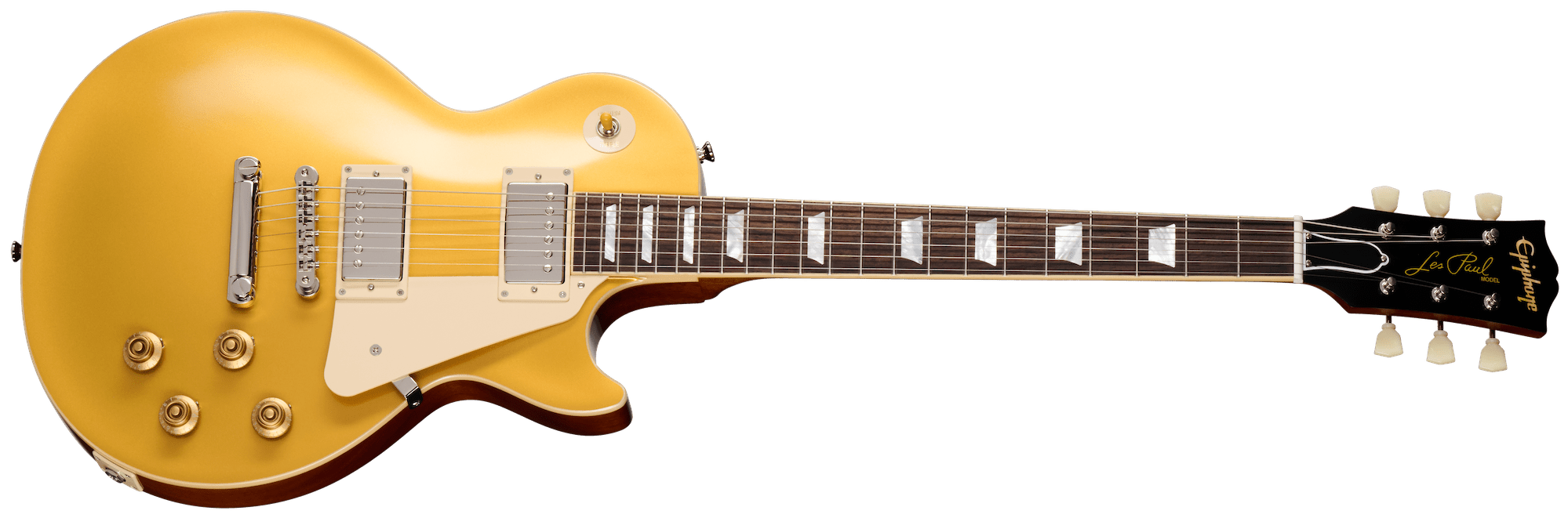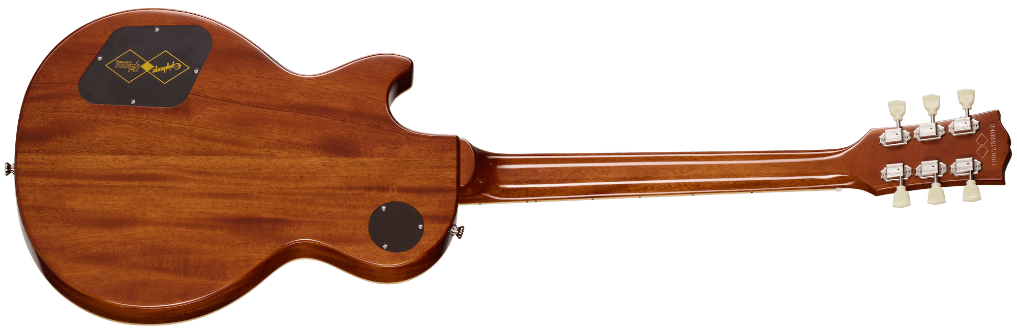 Epiphone 1957 Les Paul Goldtop Reissue leverer klassisk Les Paul-look og autentisk vintage-performance. Mahogany-body med carved maple top giver resonans og sustain, mens Vintage Gloss finishen giver et historisk korrekt udseende. Ét-stykke mahogany-halsen med 50s Rounded Medium C profil og rosewood gribebræt med mother-of-pearl trapezoid inlays sikrer komfortabel spiloplevelse. ABR-1 Tune-O-Matic bridge og historisk Stop Bar tailpiece sikrer præcis intonation, mens de to Gibson Custombucker pickups med Alnico 3 magneter, CTS potentiometre og Black Beauty papir-i-olie kondensatorer leverer klassisk Les Paul-lyd. Leveres med historisk inspireret hardshell case.