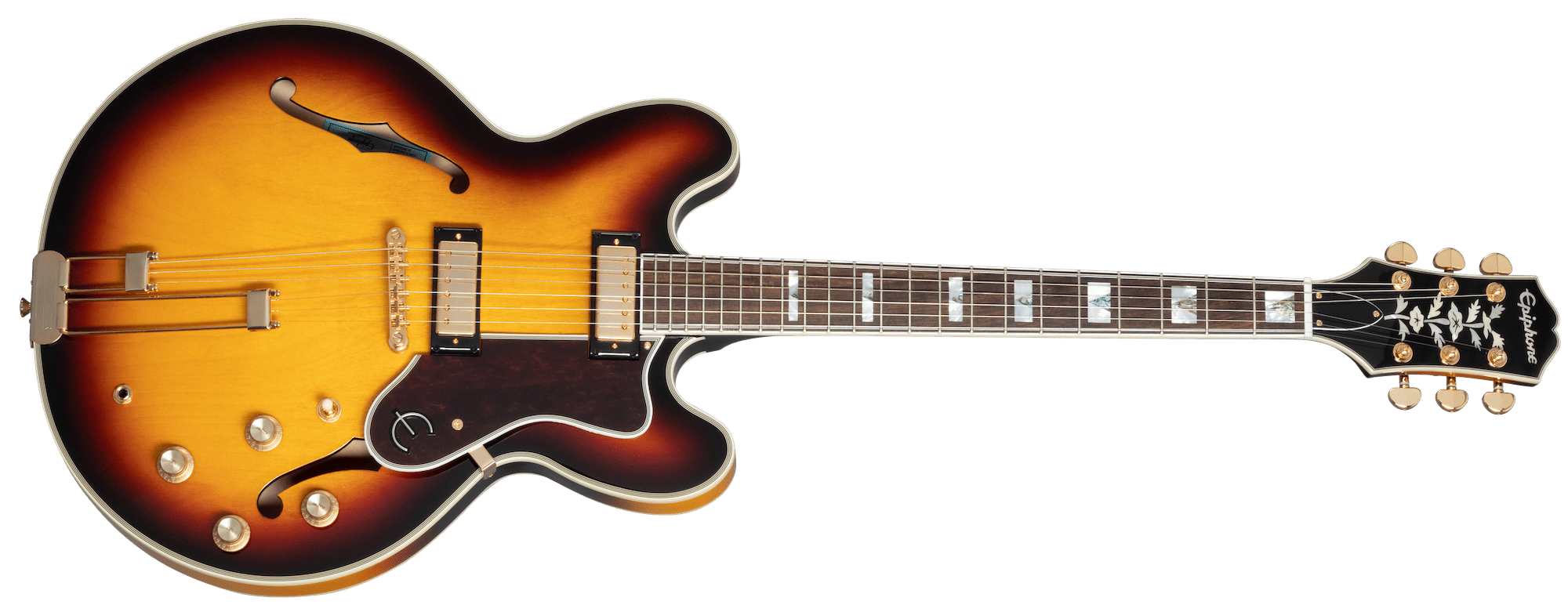 En af Epiphones mest kendte guitarer, Sheraton vender tilbage i både Vintage Sunburst og Natural finish. Dette elegante instrument har en semi-hul krop fremstillet rom-lagdelt ahorn med en ahorn centerblok for feedback modstand. Den 22-båndede mahognihals har et indbundet indisk laurbær gribebræt med blokperlemor med abalone trekant indlæg. Det indbundne guitar-hoved har et historisk Epiphone-logo og livets træ i perlemor.