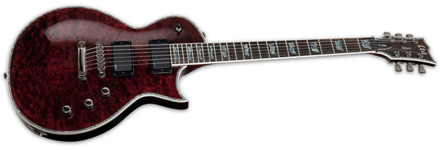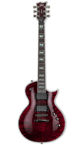 ESP - LTD EC-1000 - See Thru Black Cherry - Fra en af de mest populære serier fra ESP (LTD DELUXE 1000 serien) - EC-1000 har alle de klassiske LTD Deluxe-funktioner, der adskiller den fra andre guitarer i sit sortiment, såsom abalone-inlays og purfling, fuldkrop, hals, headstock-bindinger, og fremtrædende komponenter som LTD-låse-tunere, en Tonepros locking TOM bridge og tailpiece, og den aggressive punch af active EMG 81/60 pickupper. Den har også set-thru konstruktion, mahogni krop, 3 piece mahogni-hals og 24-bånds pau ferro gribebræt. Fås i en Black finish, See Thru Black Cherry, Vintage Black, Amber Sunburst, See Thru Green og See Thru Purple finish.