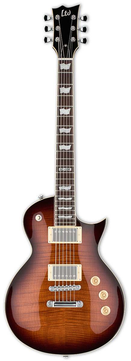 ESP LTD EC-256FM Dark Brown Sunburst er iblandt EC-serien, som er nogle af de mest ansete guitarer i historien og har mange ligheder med den overkommelige og populære LTD EC-256FM. Mahogni krop og 3 pc. neck. Rosewood gribebræt og flamed maple top. Passive pickupper, set-neck konstruktion og 22XJ frets. Du får det hele, til en meget billig pris, som du normalt ville forvente fra en sådan super fremstillet single-cutaway elektrisk guitar. EC-256FM hører hjemme hos blues, classic rock, hard rock, progressiv rock, fusion og meget mere.