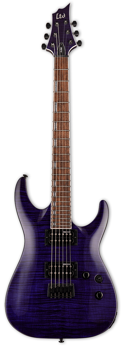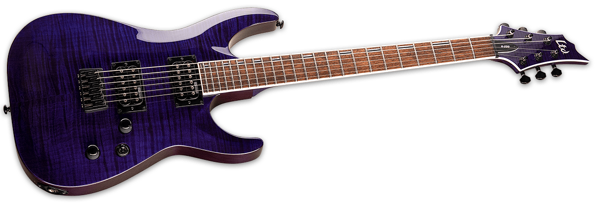 ESP - LTD H-200FM - See-Thru Purple - Guitarer i LTD 200-serien tilbyder fremragende værdi for pengene og giver højere kvalitet end næsten alle andre instrumenter i denne prisklasse. LTD H-200 er lavet med en mahogni krop, med en flammet ahorntop og "set neck" - konstruktion. Det inkluderer et par ESP Designede LH-150 humbucker pickups, der er berømt for deres aggressive tone, hvor du har mulighed for coil-split (til single coils) med en push-pull-knap / kontrol på guitarens toneknap. H-200 er også udstyret med en LTD-fast bro med "string-thru-body" design. Fås i "See Thru Purple finish".