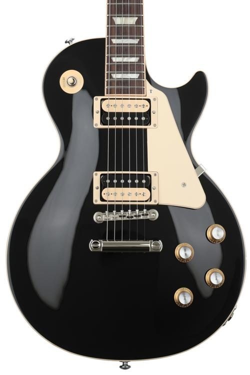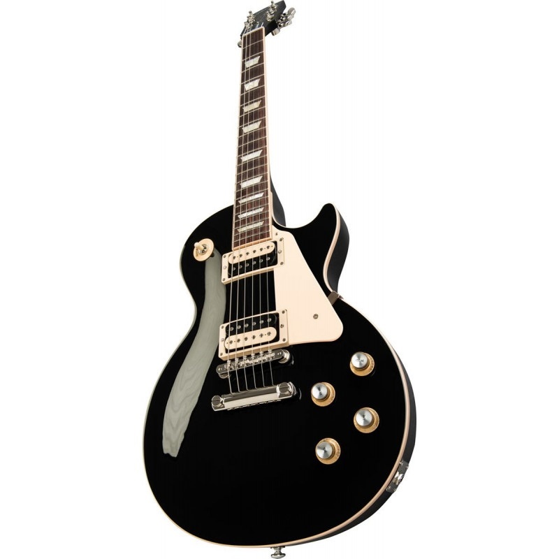 Gibson - Les Paul Classic - Ebony 2019 - Gibson Les Paul Classic kombinerer Les Paul-modellen fra de tidlige 60'er modeller med nogle funktionelle og tids-testede ændringer. Som forventet er LP Classic udformet med en mahogny bagside og ahorntop kombineret med en slank konisk hals og bindinger, palisander gribebræt. Burstbucker 61R & 61T zebra, open-coil pickups giver klassiske Gibson-toner fra æraen med lidt ekstra "punch" takket være de åbne "Coils". Der er 4 push-pull-potmetre (knapper), der giver valg af "coil-tapping", faseskift og ren bypass for funktionel og alsidig sonisk variation.