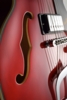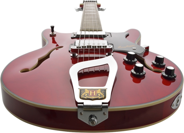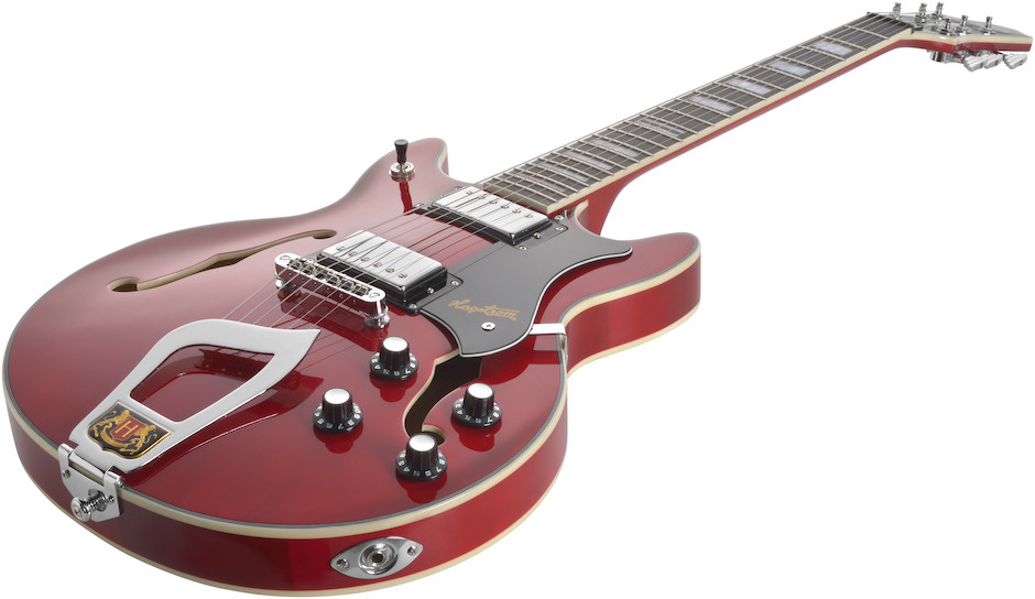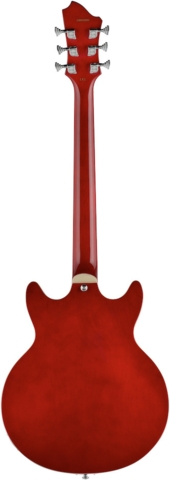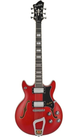 Hagstrom Alvar Wild Cherry Transparent - Denne lækre hollowbody halvakustiske vikinge guitar fra Hagström er lavet med mahognikrop og hals i mahogni, 22 bånd resinator-træ gribebræt med 24 3/4" mensur. Den første model blev præcenteret i 1965 og Elvis Presley brugte faktisk denne guitar i et af sine shows på NBC TV Special fra 1968. Der blev fremstillet mange tusind eksemplarer i flere forskellige varianter helt frem til 1979. Nutidens Vikingguitar har en hul krop med F-huller.
