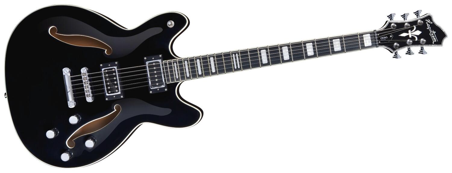 Hagström Viking Baritone Black - Viking har normalt en skala på 24,75" - men denne baritone version har en skala på 28" og leverer et bedøvende toneangreb. Super lækker Semi-hollowbody baritone guitar. Den halvakustiske Hagström Viking blev første gang præsenteret i 1965. Black. Alsidig tone, utrolig spilbarhed og slankt udseende har drevet Hagstrom Viking til sin dominerende position i den semi-hule krops guitarverden. Viking fortsætter i vikingetraditionen ved at inkorporere nøglefunktioner fra Hagströms legendariske Swede-model i en vikingeplatform.