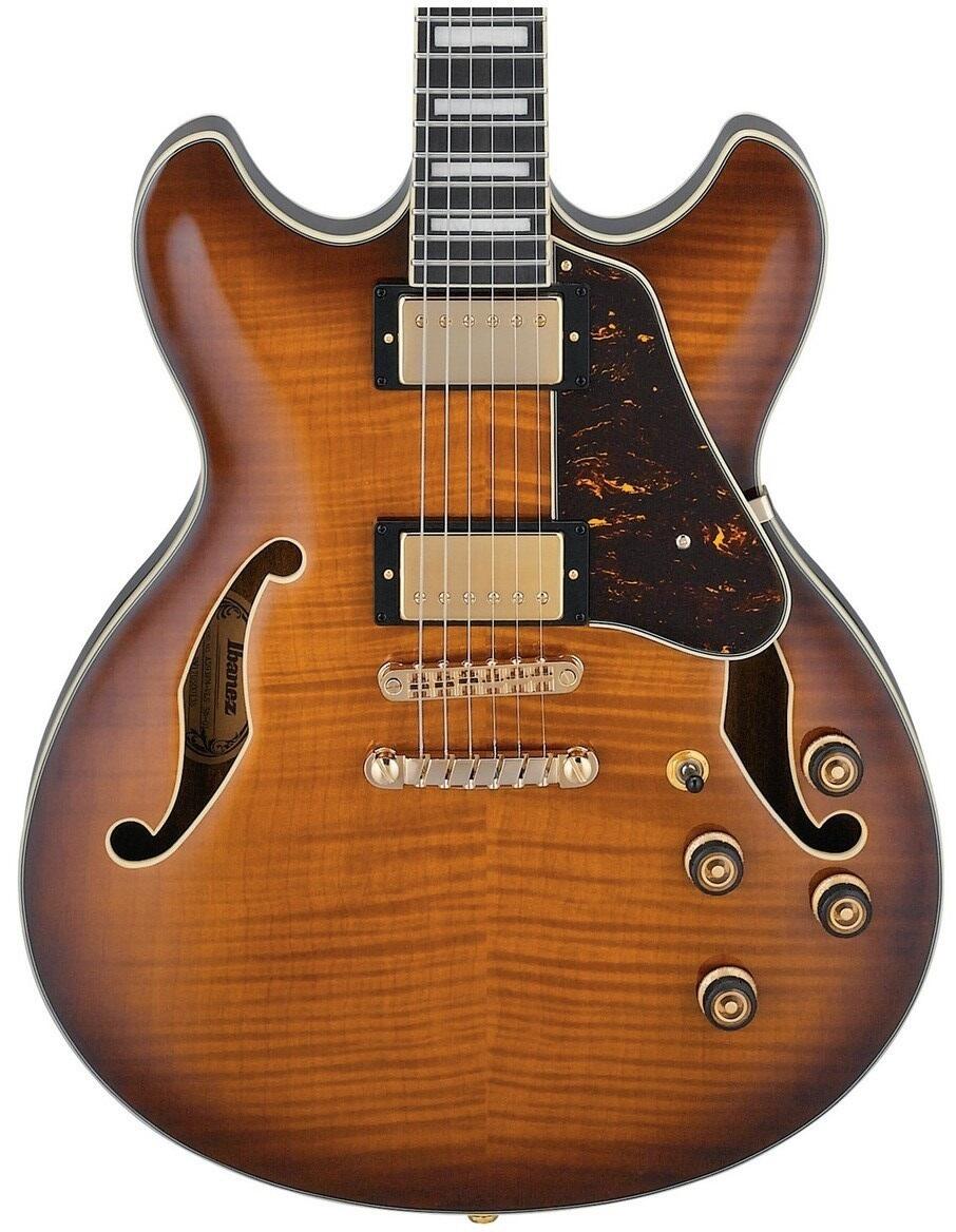 Ibanez - AS93FM-VLS - Violin Sunburst - AS93FM er en af modellerne i Ibanez Artcore Expressionist-serien. Super semi hollowbody elguitar til en god pris med forgyldt hardware. Bedre end AS53 modellerne, selvom man, også dér, får meget guitar for pengene. Med AS93 får du en guitar med et traditionelt 355. stykke med en gennemgående massiv træblok. Guitaren er meget ufølsom overfor feedback selv ved meget stærkt lydstyrke. En guitar, der fungerer godt, uanset om du spiller rent eller virkelig hardcore og alt derimellem. Guitaren har en 3-delt ekspressionistisk mahogni / ahorn form (limet ind i kroppen) hals, en mellemtyk hals med en rund, C-formet profil. Perfekt til solo- og akkordspil. Gribebrættet er lavet i ibenholt med traditionelle Pearl-blokindsatser og -binding. Pickupper er Ibanez Super 58 Custom, pickup, der kombinerer en blød og nuanceret tone med evnen til at bide, når det er nødvendigt. Fungerer lige så godt til rene og traditionelle jazz lyde som til overvældende blues og rock lyde.