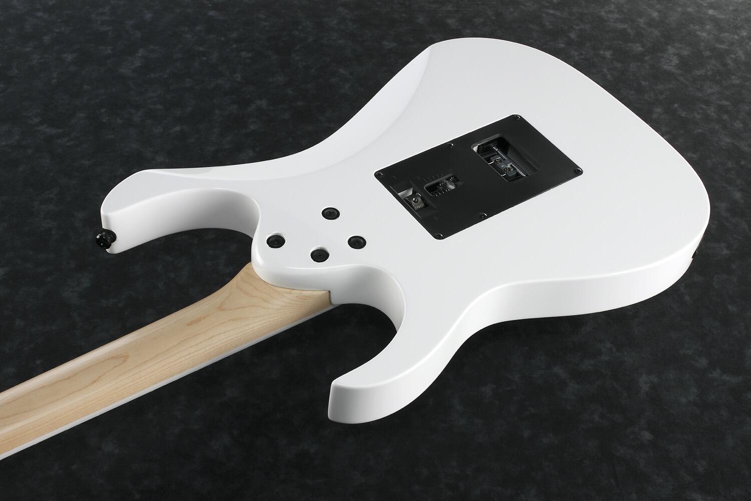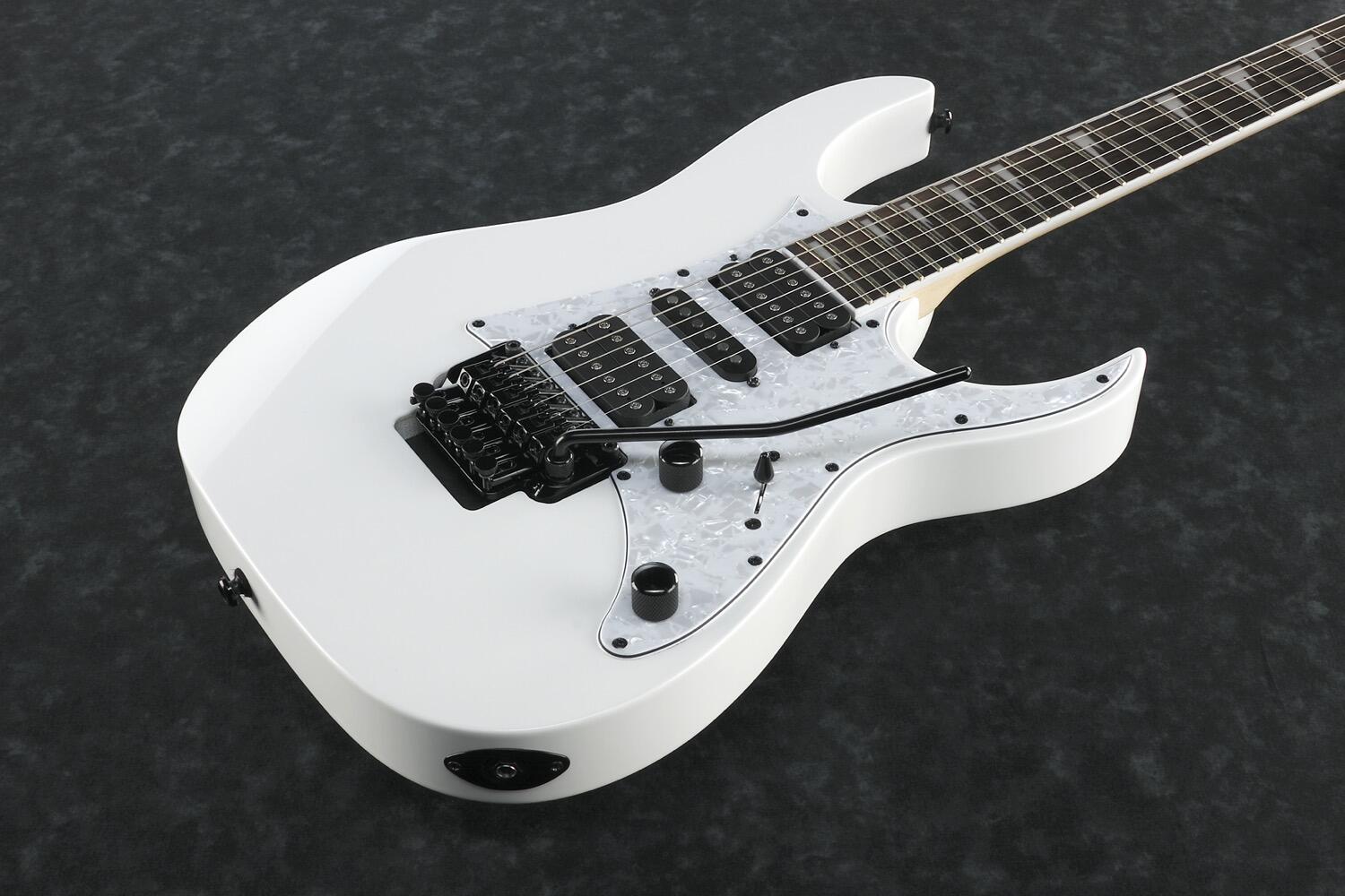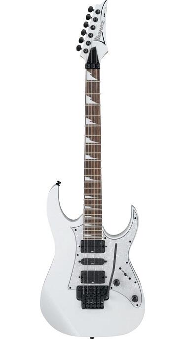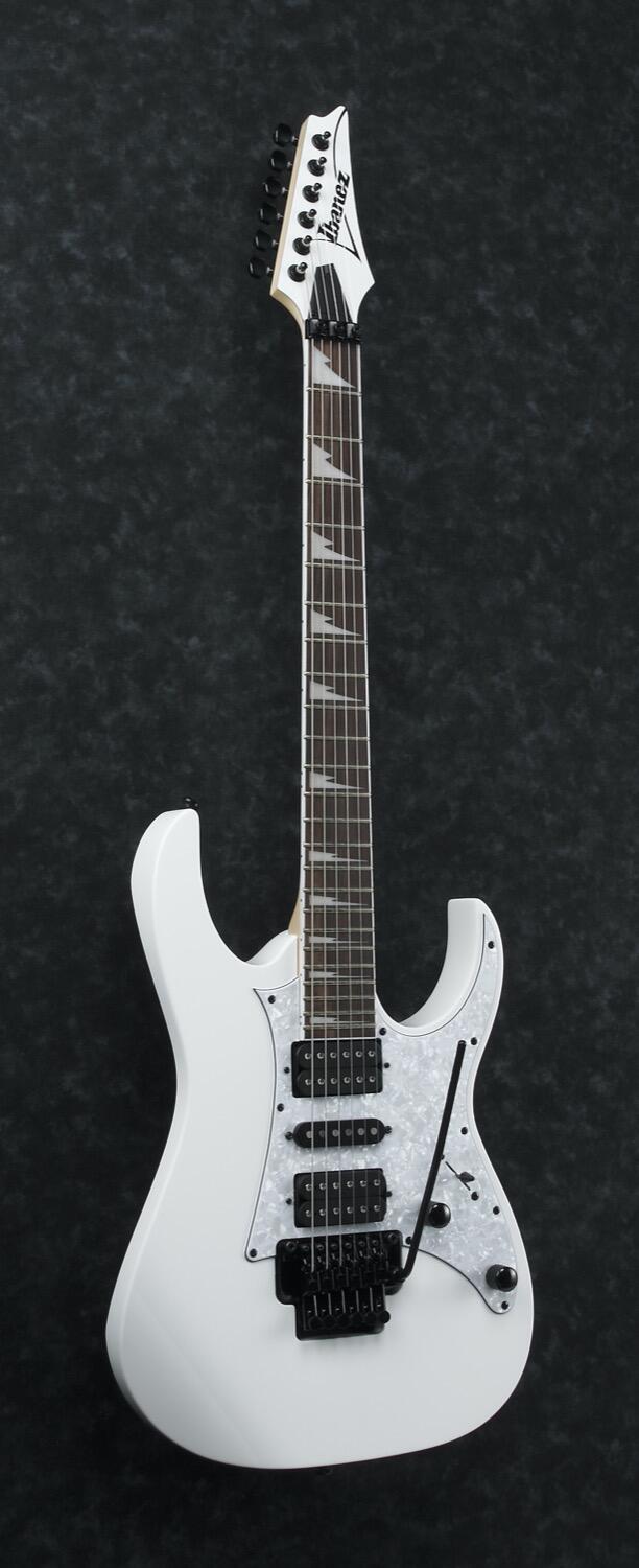 Ibanez - RG450DXZ-WH - White - El-guitar i en flot hvid - Lækker guitar fra Ibanez fra RG-Serien, Wizard III pc Ahorn hals, Bass Wood krop og rosentræ på gribebrættet med sharktooth indlæg, jumbo frets - Pick-upperne er meget støjsvage. Læs nederst i specs. Særdeles god til den billige pris.