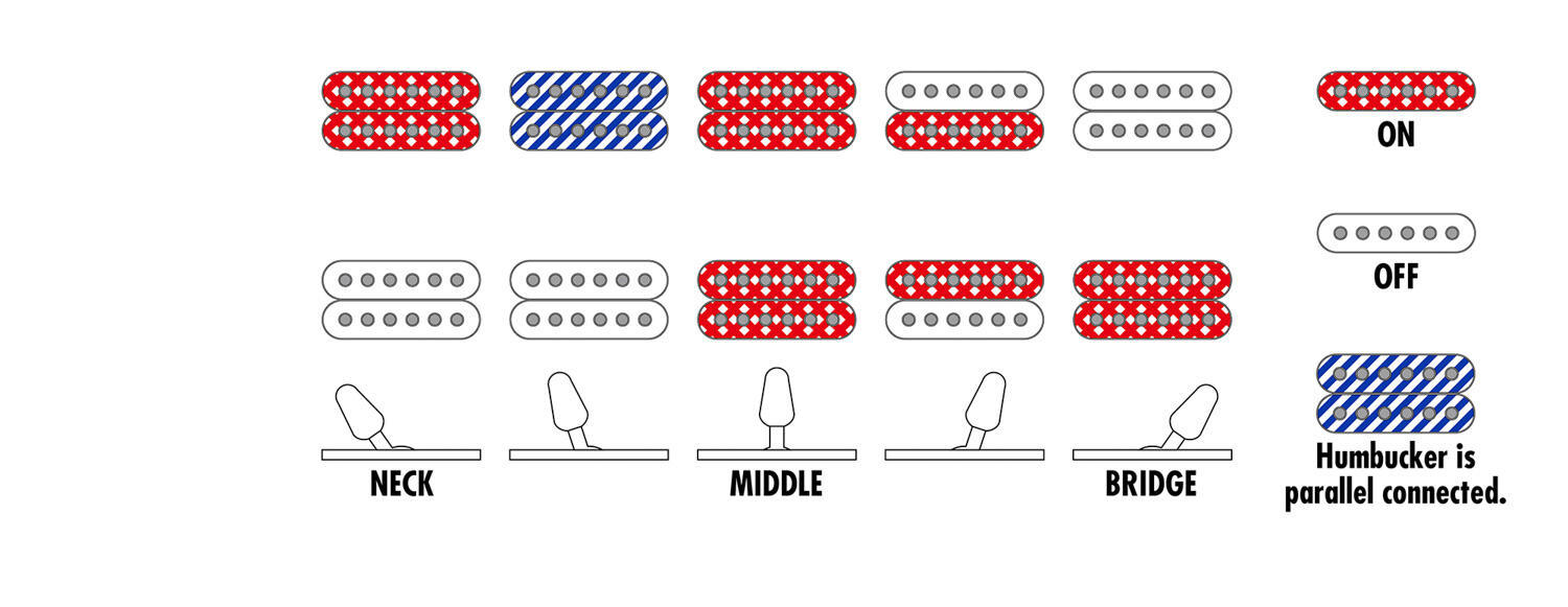 Pickupper er Ibanez QM-7, koblet på en 5-läges switch med fælles tone og volumekontrol.
