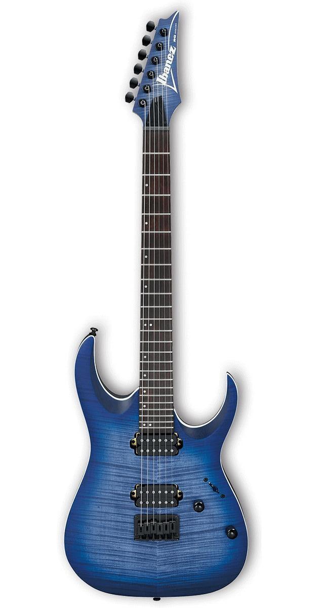 Ibanez RGA42FM-BLF (Blue Lagoon Burst Flat). RGA er simpelthen erklæret for en RG med en buet top, og det er netop den buede top, som A står for. Det gør den æstetisk mere luxuriøs og bedre at spille på, på de høje bånd og en bedre vinkel til højre hånd. Modellen er udstyret med Ibanez Quantum-pick-upper. RGA42FM er en RGA i Ibanez Standard-serien med en mahogni krop med smuk flamme ahorntop. Gyldenbrun / Dragon Eye-finish. Diskanten er lidt blødt afrundet, men uden den mister klarhed og adskillelse. Den har en dejlig frekvens-kurve i mellemregisteret, der får lyden til melodi / solo til at spille fedt og klinge med en lang sustain.