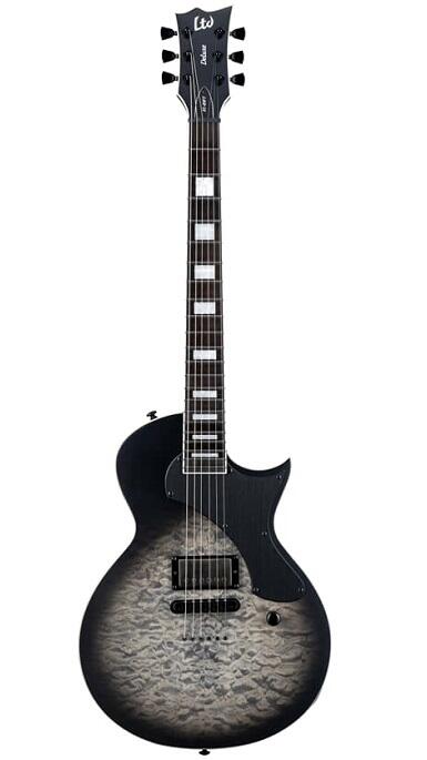 LTD Deluxe EC-01FT Charcoal Burst Satin har en hvid enkelt-lags binding, set-thru konstruktion, 24,75" skala, en enkelt udskåret mahogni krop og tredelt mahogni hals, en 43 mm saddel, et Macassar ibenholt gribebræt med pearloid blok indlæg og 22 extra-jumbo stainless steel bånd, a recessed TonePros TOM bridge og string thru body, LTD locking tuners og en eksklusiv Seymour Duncan "Custom 14" humbucker, splittable med push-pull kontrol på volumenknappen.