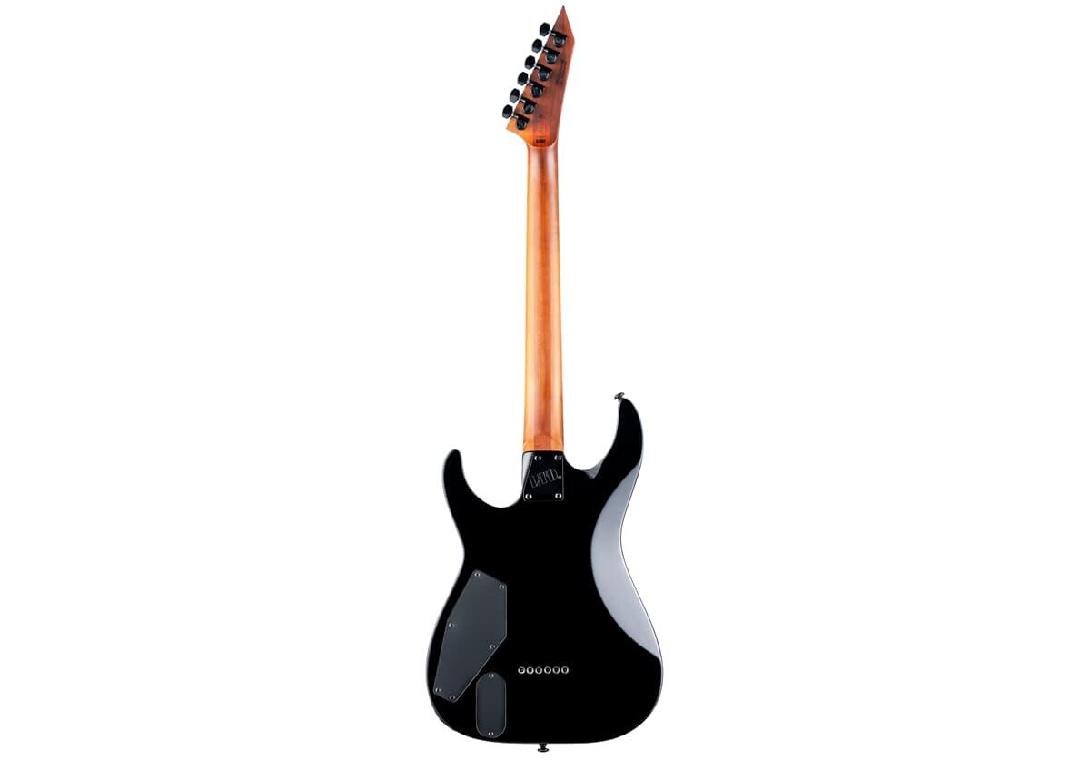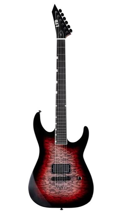 LTD JM-I i Deep Blood Moon-finish over en quiltet ahorntop, har en elletrækrop, en tredelt ristet ahornhals med bolt-on konstruktion i 25,5” skala, et Macassar gribebræt i ibenholt med 24 ekstra-jumbo bånd i rustfrit stål, Luminlay sidemarkører, en forsænket Gotoh-bro-design, en recessed Gotoh TOM bridge, string-thru-body design. en enkelt Fishman Fluence Modern Ceramic Humbucker, med voicing på en push-pull kontrol. Inkl. ESP hardshell form fit case.