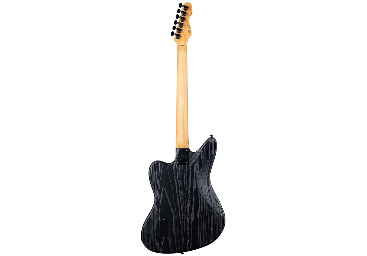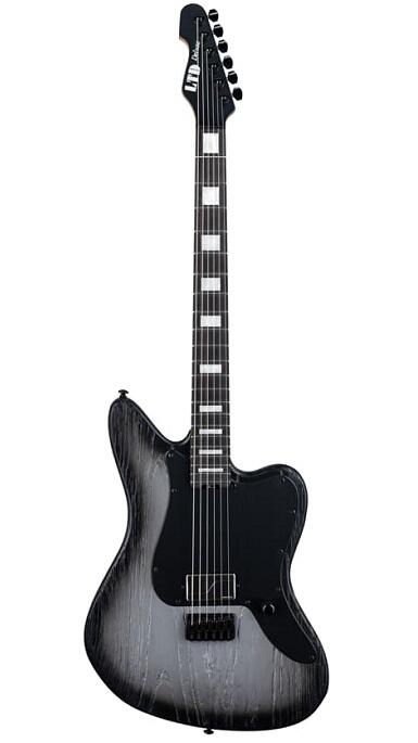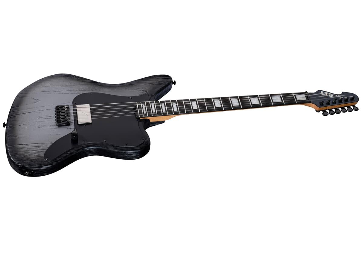 LTD Deluxe XJ-1 Baritone i Silver Blast-finish tilbyder bolt-on-konstruktion i 27" barytonskala, en sandblæst sump-askekrop med en tredelt ristet ahornhals, et Macassar gribebræt i ibenholt med blokindlæg og 22 ekstra-jumbo bånd i rustfrit stål. Det inkluderer også LTD locking tunere, sort bone nut, børstet sort pickguard, Hipshot hardtail bridge med string-thru-body og en enkelt Fishman Fluence Modern 3-Voice Humbucker pickup med stemmevalg via push/pull kontrol.