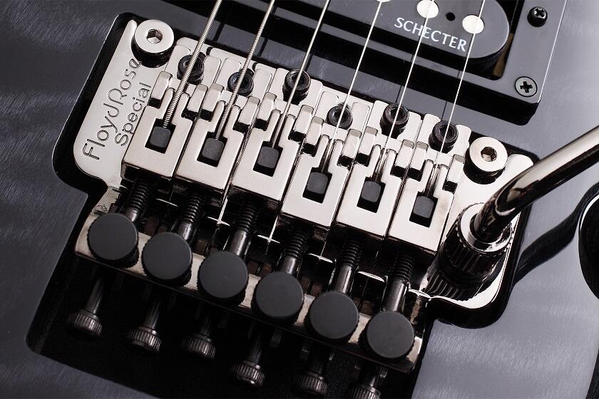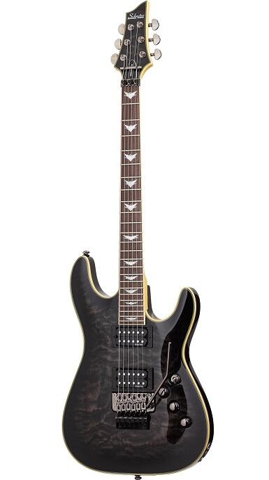 SCHECTER - Omen Extreme Floyd Rose See-Thru Black - Mahogni krop med "quilted maple" (ahorn) front, Bridge: Floyd Rose special, Neck pickup: Schecter Diamond Plus og Bridge pickup: Schecter Diamond Plus. Halsen er lavet i ahorn med rosewood gribebræt. Lavet i Indonesia.