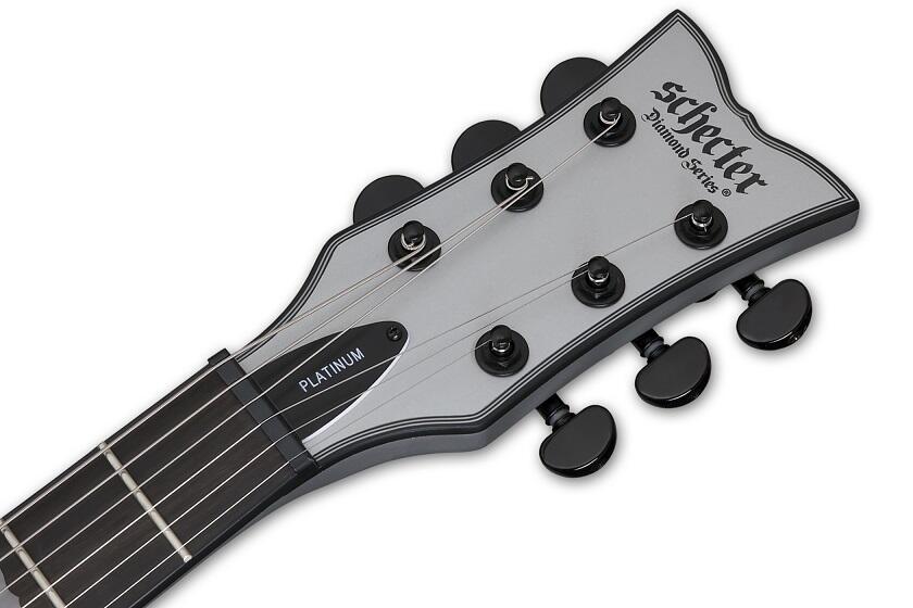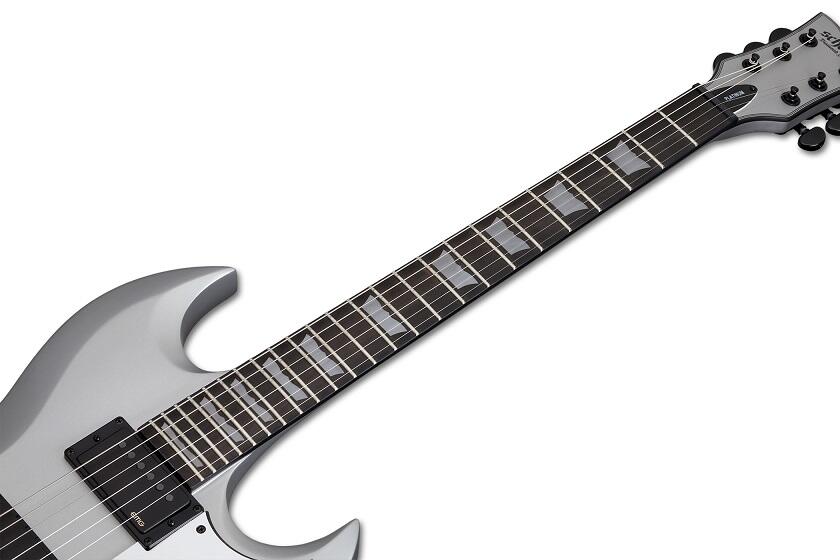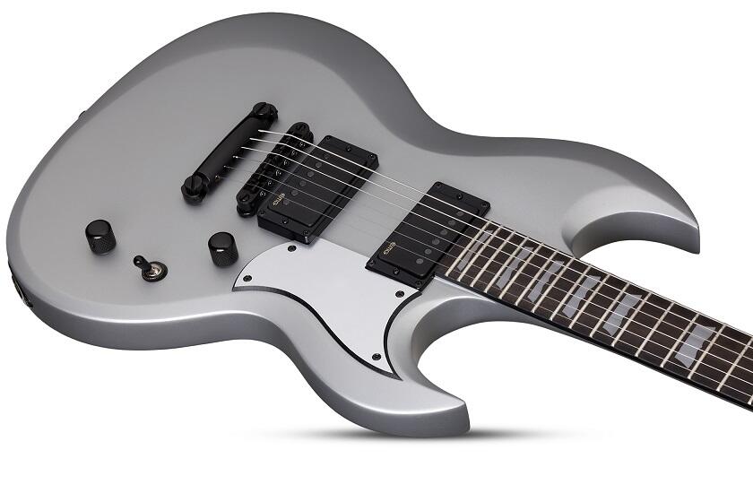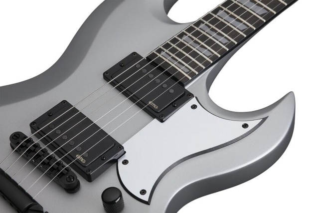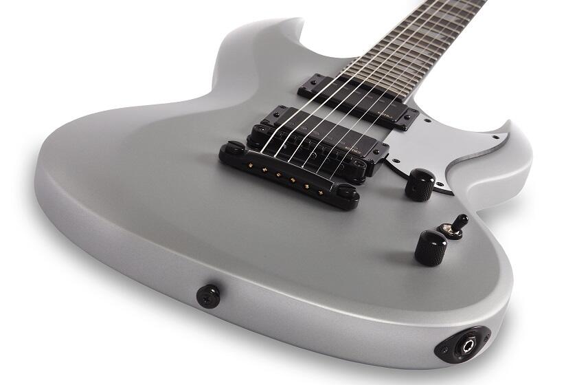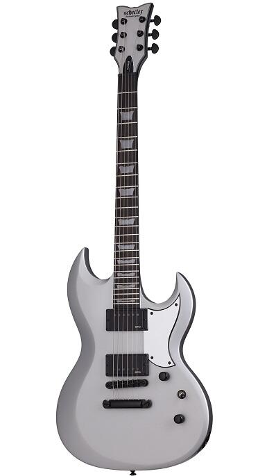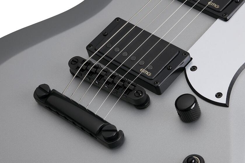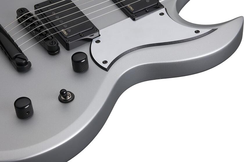 SCHECTER - S-II Platinum Satin Silver - Mahogni krop med "Flat Top w/Bevel Edge", Bridge: TonePros T3BT TOM & T1Z Tailpiece, Neck pickup: EMG 66 og Bridge pickup: EMG 57. Halsen er lavet i 3 piece ahorn med ibenholt gribebræt. Lavet i Syd Korea.