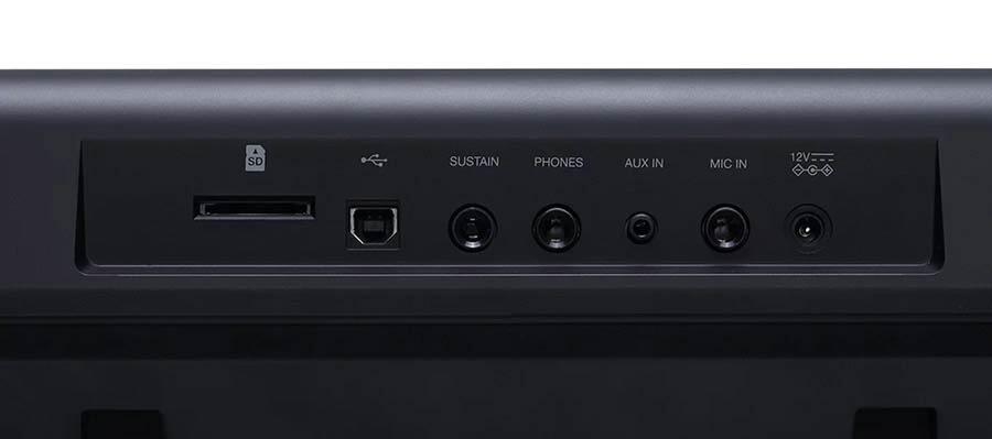 Connections: DC-power, USB-MIDI / USB audio, headphone / output (6,3 mm jack), input (3,5 mm jack), microphone (6,3 mm jack), pedal sustain (6,3 mm jack), SD card slot