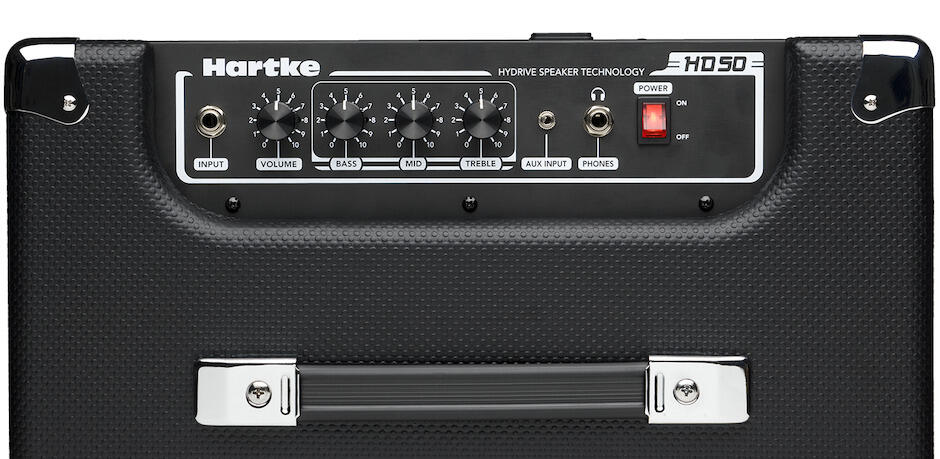 Hartke - HD50 - Kompakt lille bas combo forstærker med en 10" Hydrive Hybrid bas-enhed og en 2" diskant. Denne lille forstærker klare 50 W uden problemer og er med aktivt / passivt input, volume kontrol og 3 bånds EQ, 3,5 mm stereo AUX indgang, hovedtelefon udgang samt indbygget limiter.