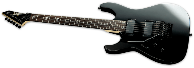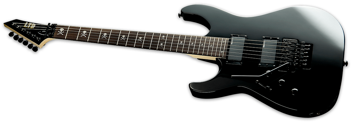 ESP LTD Signature KH202 BLK LH Kirk Hammett - venstrehånds - Det er som den originale ESP: Floyd Rose Tremelo, sort hardware, Skull & Crossbones indlæg i palisander gribebrættet og en bolt on hals med omvendt hovedhoved.