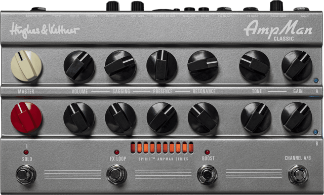 Designed specifically for use with stomp boxes, AmpMan Classic brings out the best in your pedal board. A switchable FX Loop is available for reverb and delay effects. You can preset a second master volume with the Solo knob, and then activate it at the touch of a button to bump up the level to bring your lead lines to the fore.