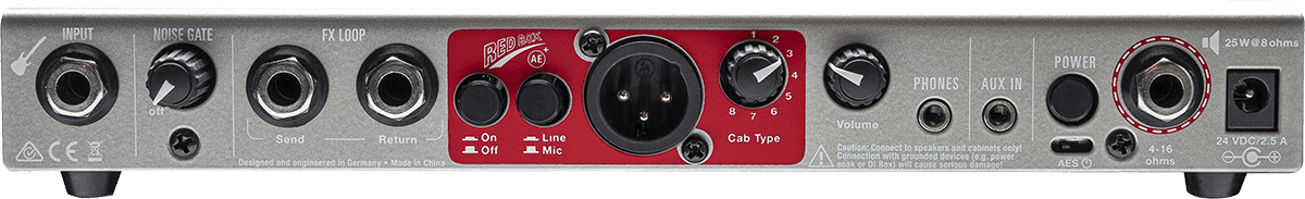 AmpMan Classic comes with the RED BOX AE+, which provides eight excellent cabinet simulations. It automatically saves the most recently selected speaker for each channel. If you want to use an outboard device’s digital IR cab simulations, simply switch off the RED BOX.