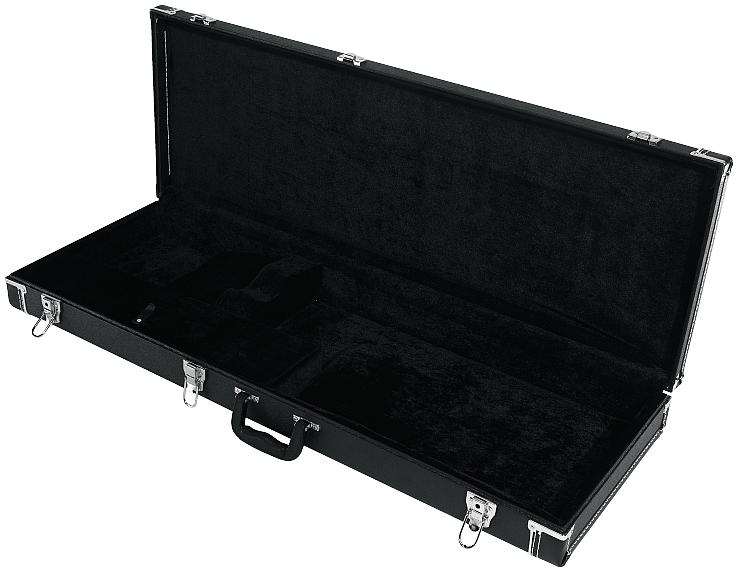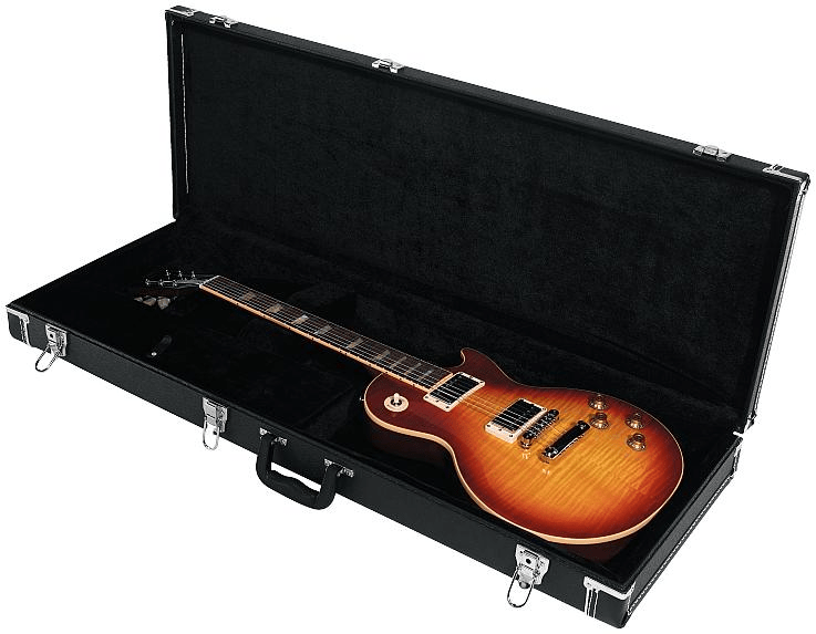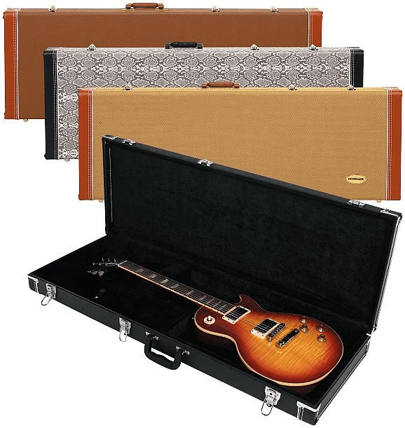 RockCase - Standard Line - LP eller SG-Style - Solid guitar hardshell kasse med sort Tolex-dækning til forskellige klassiske konstruktionsformer. Optimal beskyttelse af dit instrument med det en bred halspude med ekstra nakkestøtte og Headstock Support System samt en tyk skum-materiale-indsats i midten af låget og de indvendige kanter, der er styrket med skumgummi. Den indvendige foring af sort fløjl er skånsomt til den følsomme instrument-finish. Separat rum indeni med låg til opbevaring af forskellige tilbehørsdele. Massive låse, metalfødder og et robust syntetisk håndtag giver en sikker og stressfri håndtering. Passer til alle Les Paul guitarer.