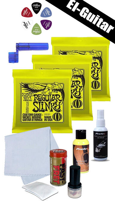 Guitar Tilbehør Pakke - El-Guitar - Ernie Ball - Tilbehørpakke til El-guitar guitarister med 3 sæt valgfrie Ernie Ball strenge samt: Fast Fret, Polerings-olie til gribebrættet, Polering til kroppen, 5 Plektre, Sting Winder og gratis polerings-klud.