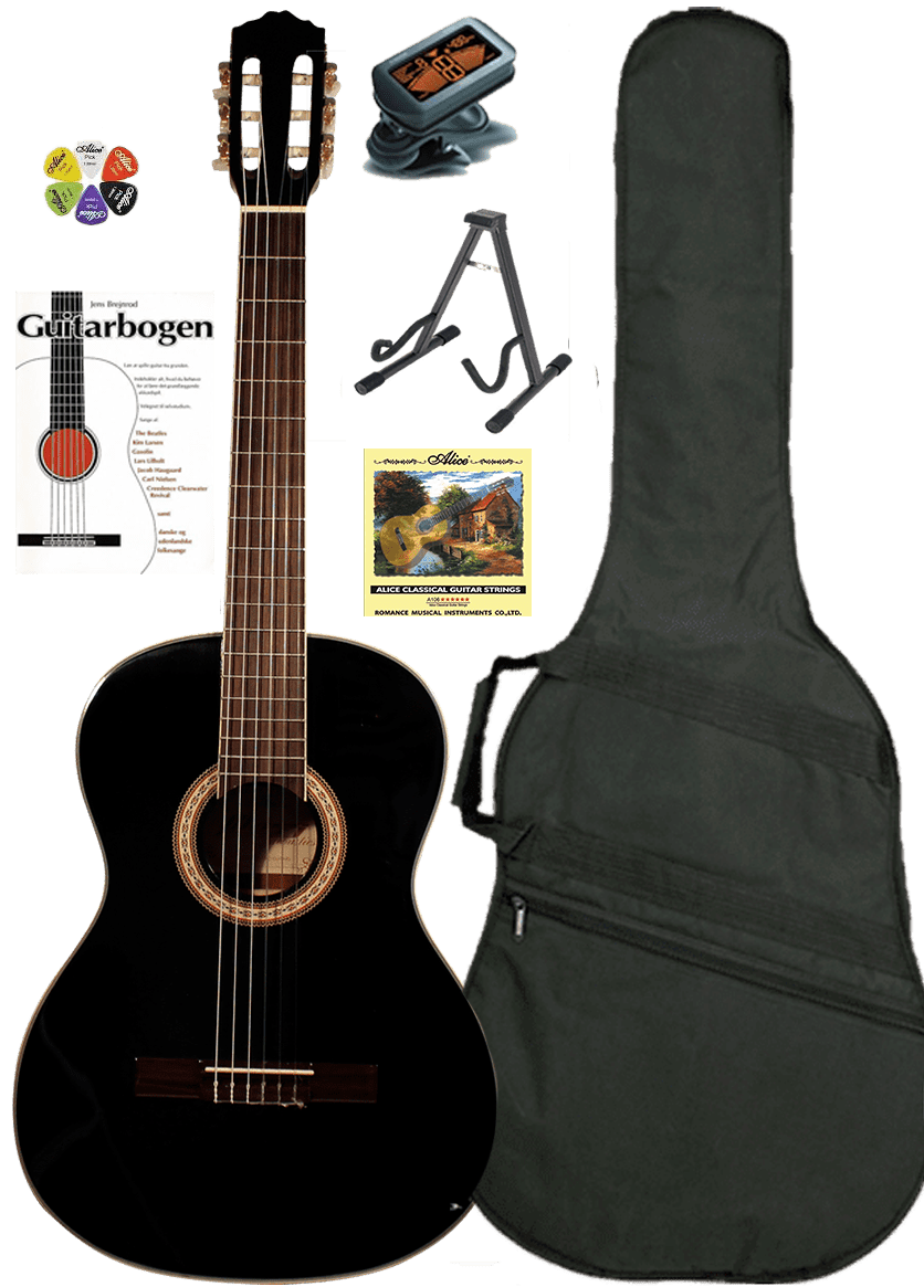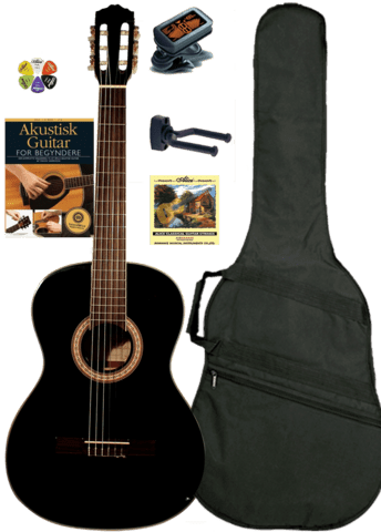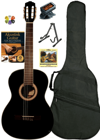 Du kan til dels selv sammensætte denne pakke med stativ eller ophæng og der medfølger f.eks. Guitarbogen 1 med alt hvad du behøver for at lære det grundlæggende akkordspil. Velegnet til selvstudium. Indeholder sange af bl.a. Beatles, Kim Larsen, Gasolin, Lars Lilholt, Jakob Haugaard, Carl Nielsen, Creedence Clearwater Revival samt danske og udenlandske folkesange. Eller bogen " Akustisk guitar for begyndere "
