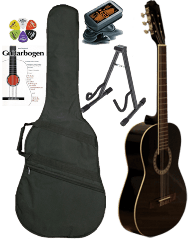 Akustisk guitar C-777BK VENSTREHÅNDS komplet pakketilbud **Spar 87,50 DKK** - Her er een af vores mest solgte guitarer med alt hvad der skal bruges for at komme igang med at spille guitar. Guitaren fra Santoni Guitars er i fuld størrelse og anbefales til voksne og børn over 9 år. Der medfølger alt efter hvilken pakke du vælger, Guitarbogen 1 med alt hvad du behøver for at lære det grundlæggende akkordspil. Velegnet til selvstudium. Indeholder sange af bl.a. Beatles, Kim Larsen, Gasolin, Lars Lilholt, Jakob Haugaard, Carl Nielsen, Creedence Clearwater Revival samt danske og udenlandske folkesange eller bogen " Akustisk guitar for begyndere - God håndbog om til at lære at spille akustisk guitar og er inkl. e-bog / download.