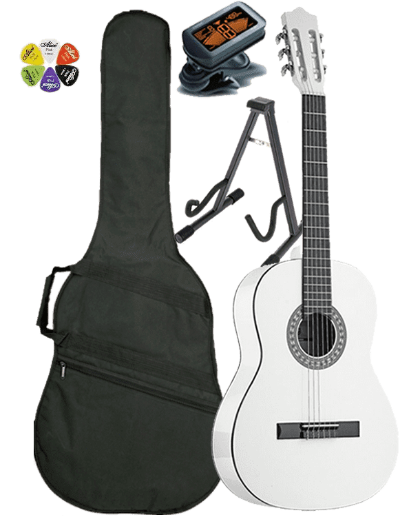 Endnu een af vores absolutte bestsellers. Du får her en rigtig flot og velklingende guitar fra Santoni i flot hvidt design. Pakken indeholder: Guitar, Tuner, Ophæng, 5 x Plektre og en taske.