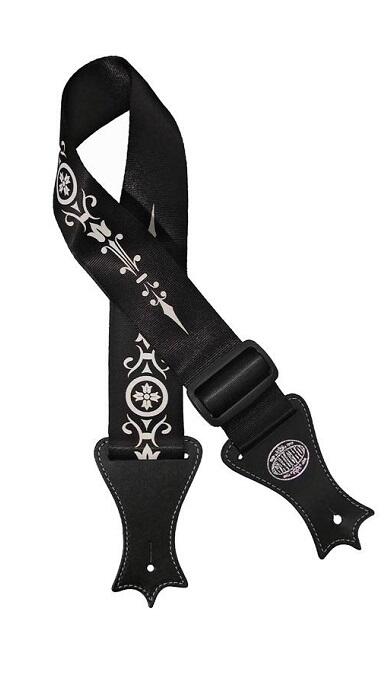 guitar strap, deluxe black nylon with faux leather slips, with ornament print