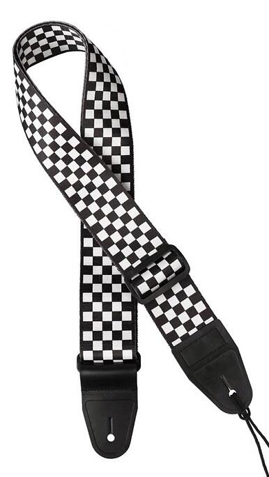 guitar strap, deluxe black nylon with faux leather slips, with "Checkers Deck" print