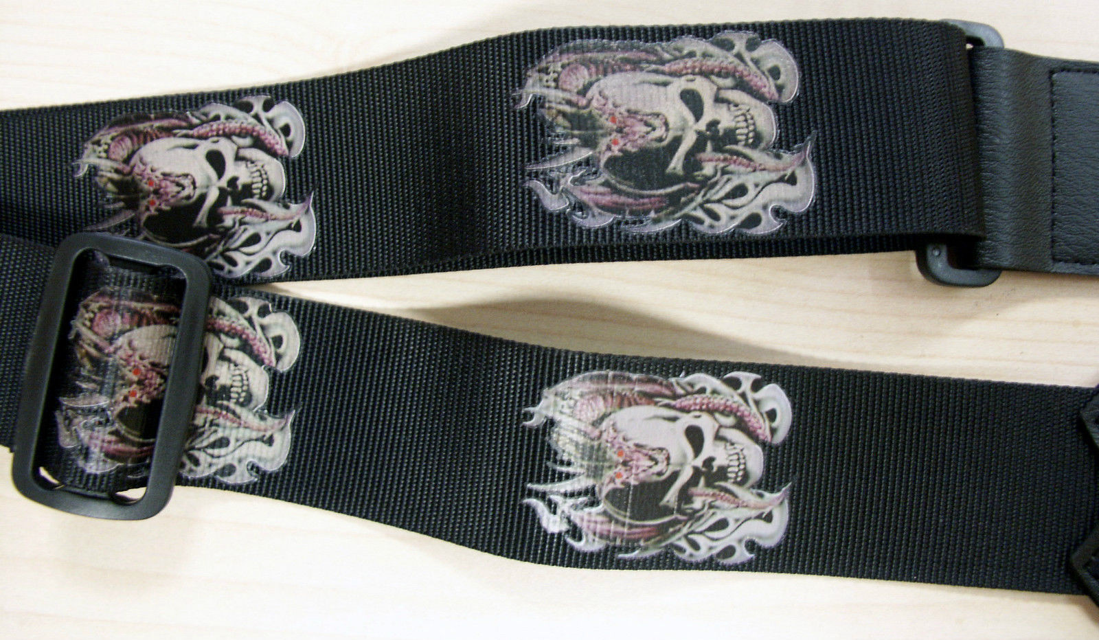 Fed Guitar rem med dødninge hoved motiv - 3" Dødningehoveder - Lavet af blødt holdbart nylon materiale i god kvalitet og med justering fra 80 - 140 cm , 4 cm bredde.