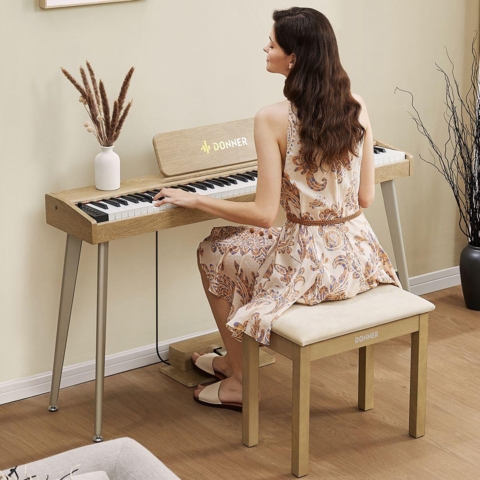 Donner Bench klaverbænk beige - Denne klaverbænk fra Donner, er bygget solidt i massivt træ og med et simpelt, tidløst design, som både passer ind i langt de fleste hjem og til langt de fleste klaverer.