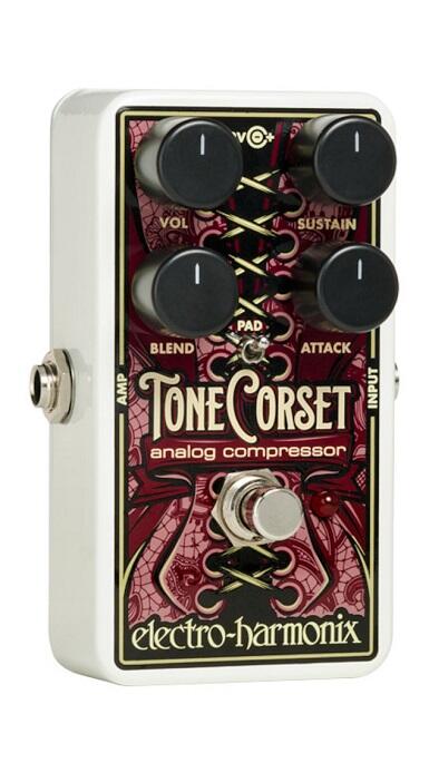 Electro Harmonix - Tone Corset - Fire-knap design analog kompressor til guitar / bas, der giver en fremragende kontrol og giver musikeren mulighed for præcist at forme instrumentets dynamik. Volume, Sustain, blend, attack og Pad-switchen blokerer for indgangssignalet for at forhindre uønsket forvrængning, hvis Tone Coret bruges sammen med high output humbuckers, basguitar osv.