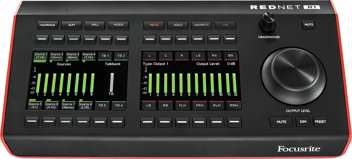 FOCUSRITE REDNET R1 - RedNet R1 er en desktop-remote, der supercharger enhver Red Range-interface ved at gøre det muligt for audioprofessionelle at interagere med deres lyd som aldrig før. Den kan styre en række forskellige monitor-output-opsætninger, lige fra mono til 7.1.4 surround, inklusive Dolby Atmos® og andre fordybende lydworkflows. Alternativt kan helt brugerdefinerede opsætninger på op til 12 udgange konfigureres til skræddersyede højttalerkonfigurationer.