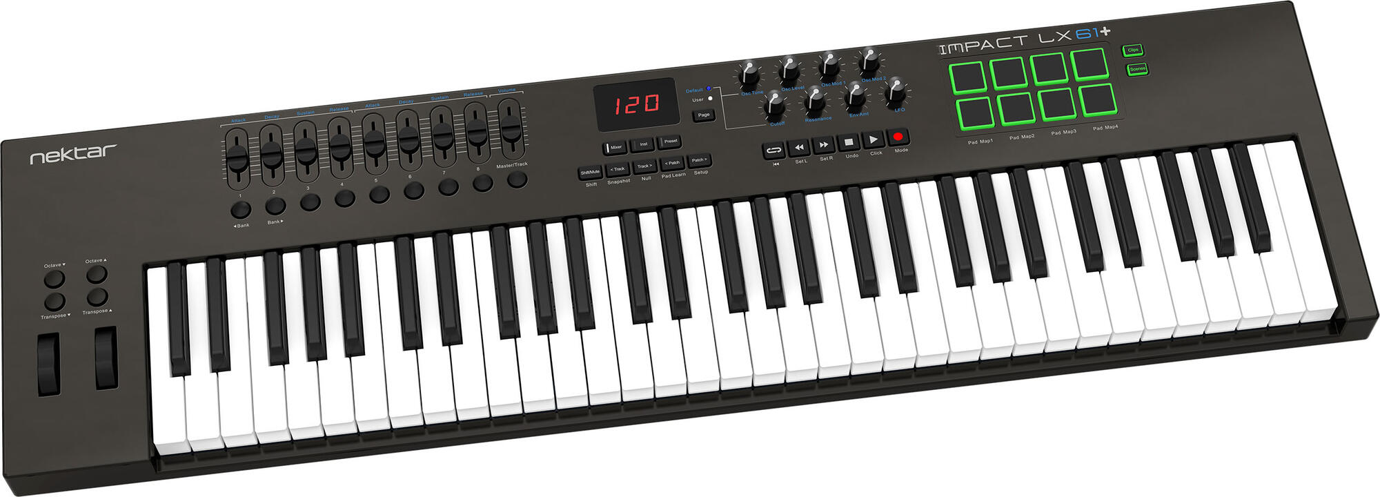 Nektar Impact LX61+ 61-tangenters USB-keyboard med 9st drawbars, 8st drejeknapper, 8st drumpads, 6st transport-knappar mm. - Kompatibel med Bitwig, Cubase, Digital Performer, FL Studio, GarageBand, Logic, Nuendo, Reaper, Reason, Sonar og Studio One. Bitwig 8-Track inkluderet.