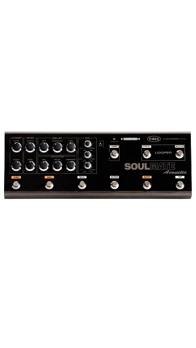 T-Rex - Soulmate Acoustic - Lækkert uundværligt guitarboard til akustisk guitar med alle de nødvendige effekter. Kompressor, boost, Stereo line/D.I. outputs, 5 min. looper, jack-stik til expression pedal (Volume kontrol), Varm delay med tap tempo, 3-bånds parametisk EQ, automatisk feedback suppresion, modulation, Hall reverb (rumklang - kan styres via. expression pedal), FET forforstærker (High/low impedance) og med fase-skifter.
