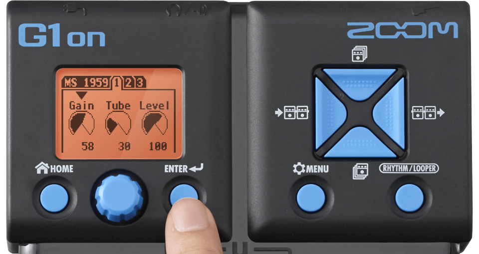 Zoom G1on - Fed multieffekt pedal fra Zoom med looper. Der er indbygget 100 effekter der inkluderer distortion, compression, modulation, delay, og reverb. Man kan sætte op til 5 effekter sammen i en hvilket som helst rækkefølge. Der er 10 brugerprogrampladser (banks) til dine egne indstillinger. Looper funktionen kan optage i op til 30 sekunder / 64 beats i CD-qualitet, 68 indbyggede rytmer der kan bruges i forbindelse med looper' en. Bruger 4 AA batterier (Medfølger) eller strømforsyning (Medfølger ikke).