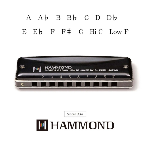 Suzuki Hammond HA-20 - Vælg Toneart! - Har du nogensinde ønsket et Hammond-orgel, der passer i lommen? Med denne mundharmonika er det muligt! Mundharmonikaen er måske lille, men lyden er overraskende stor og smuk. Konstrueret med phosphor bronze, hvilket bidrager til den klare lyd. Suzuki Hammond HA-20 Harmonica har det farvede Hammond-logo, der giver et smukt look mod dets sorte skal. En bæretaske er med hård skal er inkluderet.