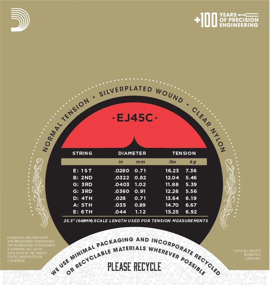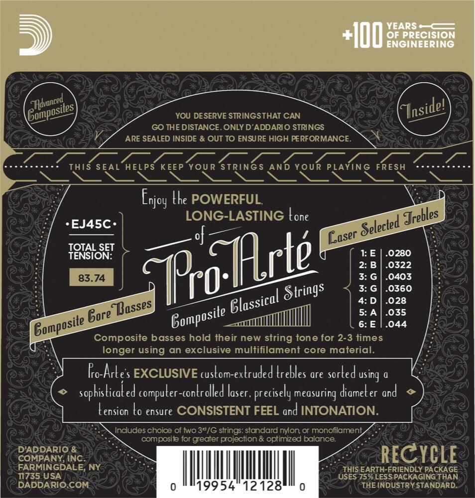 D'Addario EJ45C - Normal Composite - Pro Arte. Flere års udvikling førte til Pro Arte serien, hvor hver nylon strengs diameter kontrolleres 200 gange af en sofistikeret computerstyret laser.
