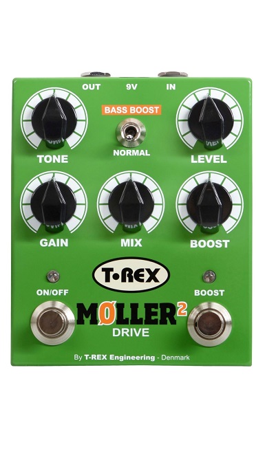 T-Rex Møller 2 leverer den samme klassiske overdrive som forgængeren, der var en af T-Rex mest efterspurgte pedaler. Navngivet efter den danske guitarist Knud Møller, der fik den originale pedal designet af T-Rex. Møller 2 har en mere holdbar "Bass Boost" -kontakt og det er lettere at læse kontrolknapgrafikken. Pedalen er bevæbnet med en 0-20 db Clean Boost, samt en Mix-kontrol, som giver dig mulighed for at oprette den perfekte balance mellem forvrængede og rene signaler. Skruet helt op og med max distortion, lyder pedalen ligesom en vintage tube forstærker på fuld volumen. Skru Mix-knappen lidt tilbage, og dit rene signal begynder at komme igennem; hvis du strummer lidt eller skruer guitar volumen tilbage, får du en fantastisk ren, blød "clipping-sound", der bevarer al din tone og dynamik, bare endnu større, højere og rigere. Med boost-funktionen får du ekstra saft og kraft til dine soli, ligemeget om overdrive-kredsløbet er aktiveret eller ej.