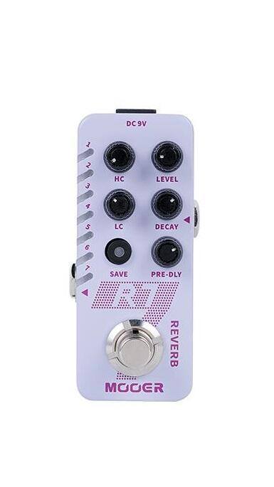 Mooer - R7 REVERB - Digital rumklangs-pedal med "rige, klassiske rumklangstoner". R7 har 7 typer af reverb-effekter - lige fra “Church” to the “Cave”. Man kan gemme sine effekt-indstillinger.