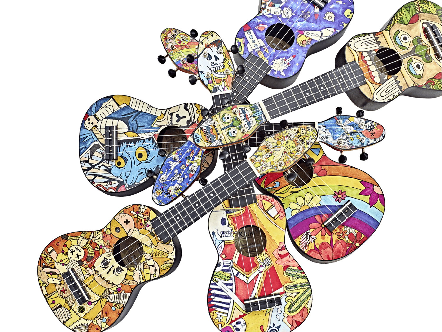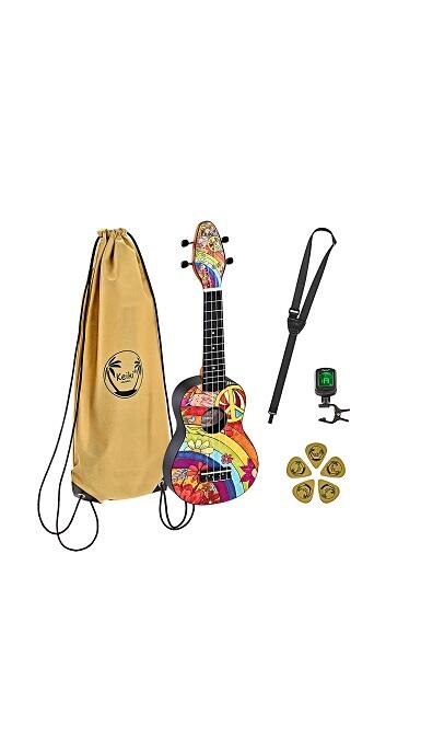 K-2-serien fra Ortegas Keiki-serie er ukulele i fuld størrelse, der kommer i en pakke med tuner, skulderrem, taske og plektre. Hver model har et design af gadekunstneren Guglielmo Gasloli.