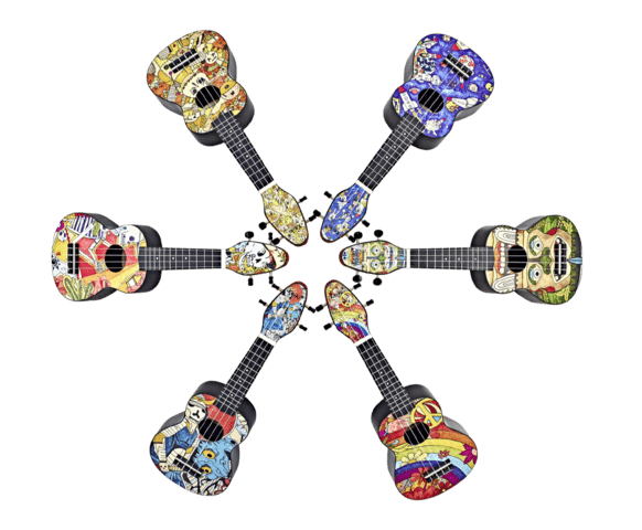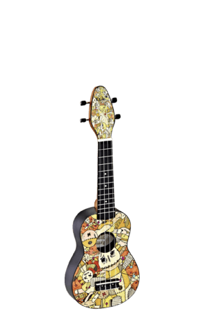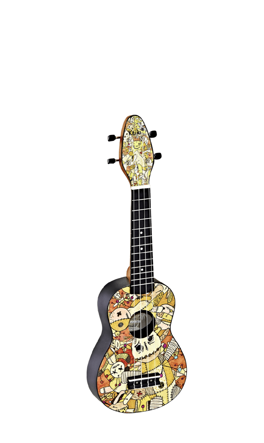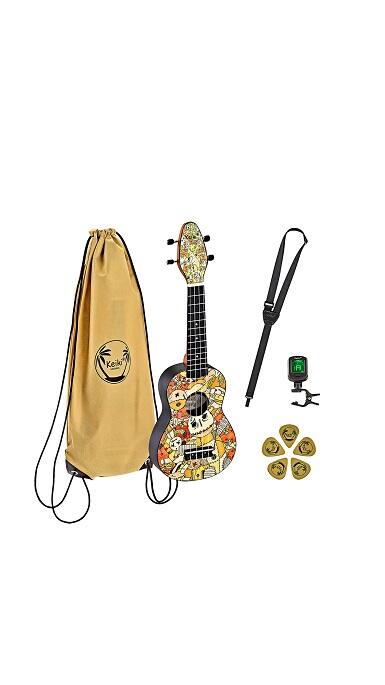 K-2-serien fra Ortegas Keiki-serie er ukulele i fuld størrelse, der kommer i en pakke med tuner, skulderrem, taske og plektre. Hver model har et design af gadekunstneren Guglielmo Gasloli.