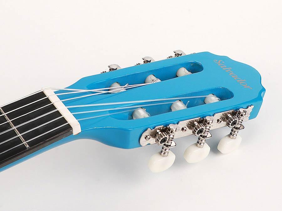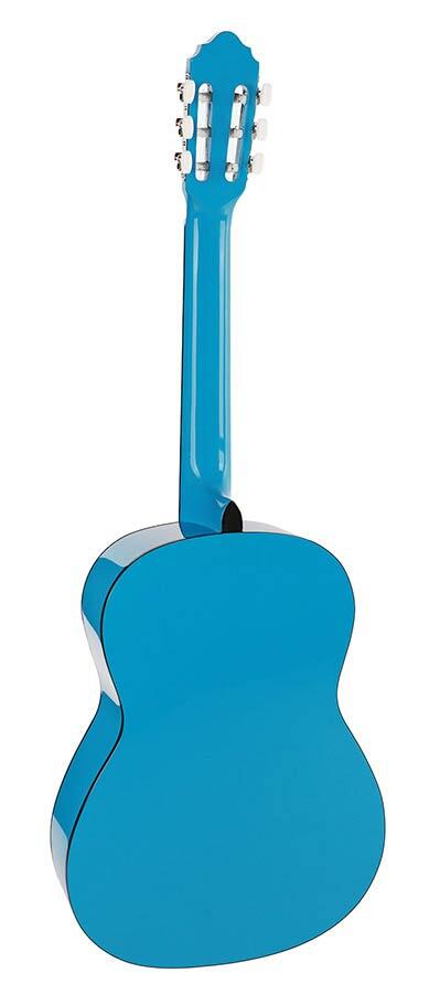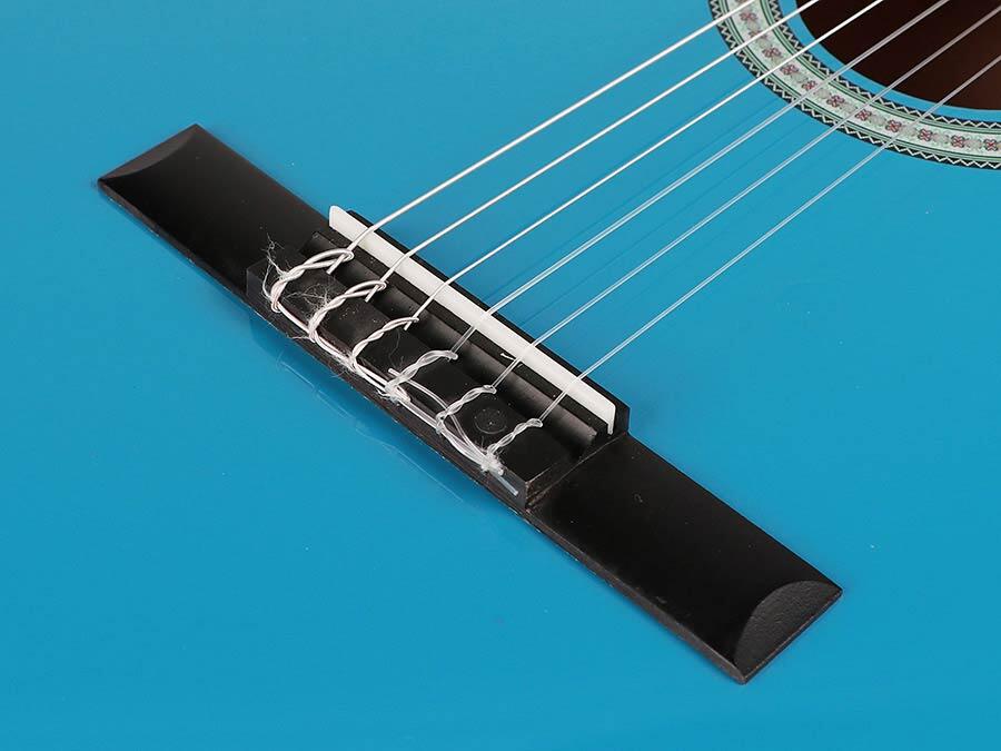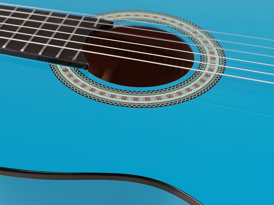 klassisk guitar i fuld skala, lindetræ bagside og sider, nikkel bånd, trussrod, blank blå finish