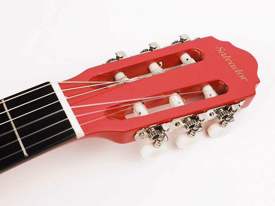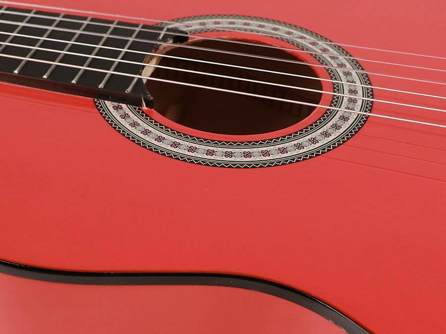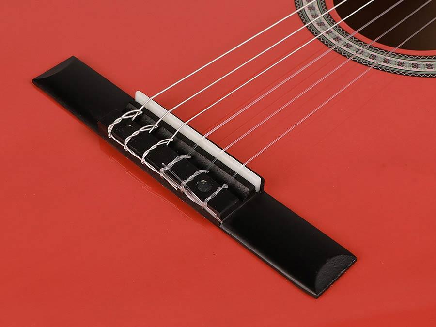 klassisk guitar i fuld skala, lindetræ bagside og sider, nikkel bånd, trussrod, blank rød finish